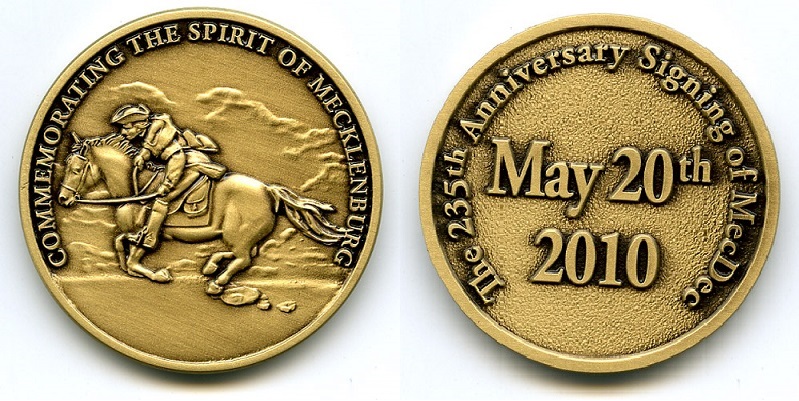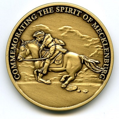 This coin was minted to celebrate the unveiling of the Capt. James Jack statue in Charlotte, NC, on May 20th, 2010. One side shows Captain Jack on his ride to Philadelphia. The other gives the date of the statue's unveiling.