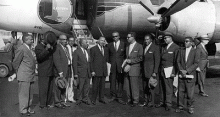 At the new Douglas Municipal Airport, Pastors Calhoun, Wertz, Hawkins, Givens, Martin Luther King, Jr., Kelly Alexander, Sr., Pastors Kerry, Humphrey, Shipman, and an unknown person are departing for the National Baptist Convention.