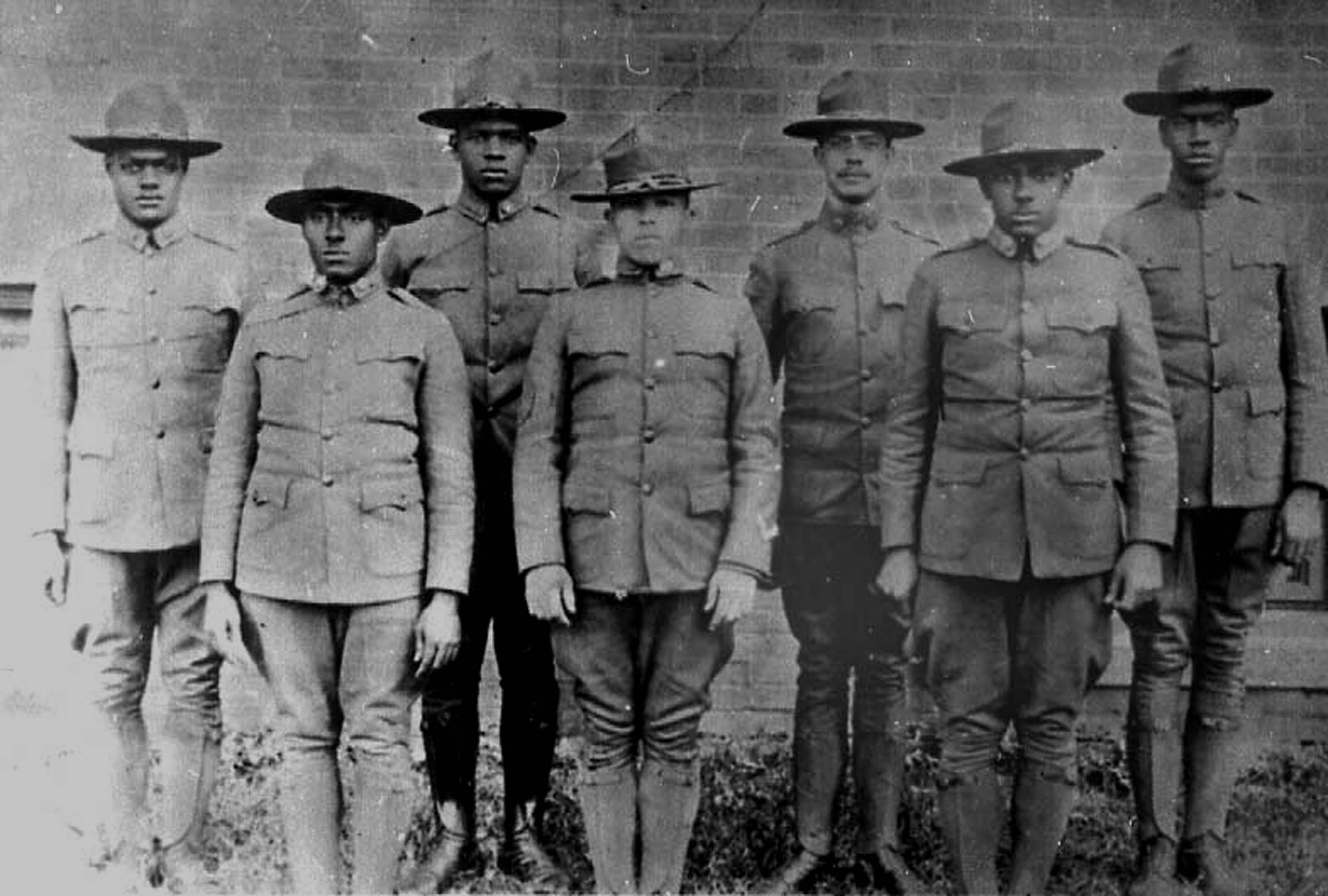 Charlotte doctors who served in the Howard University ROTC, c. 1920. Left to right: W. E. Hill, Russell Lewis, Hobart T. Allen, Lawrence McCrorey, J. N. Seabrooks, R. M. Wyche, Connie Jenkins.