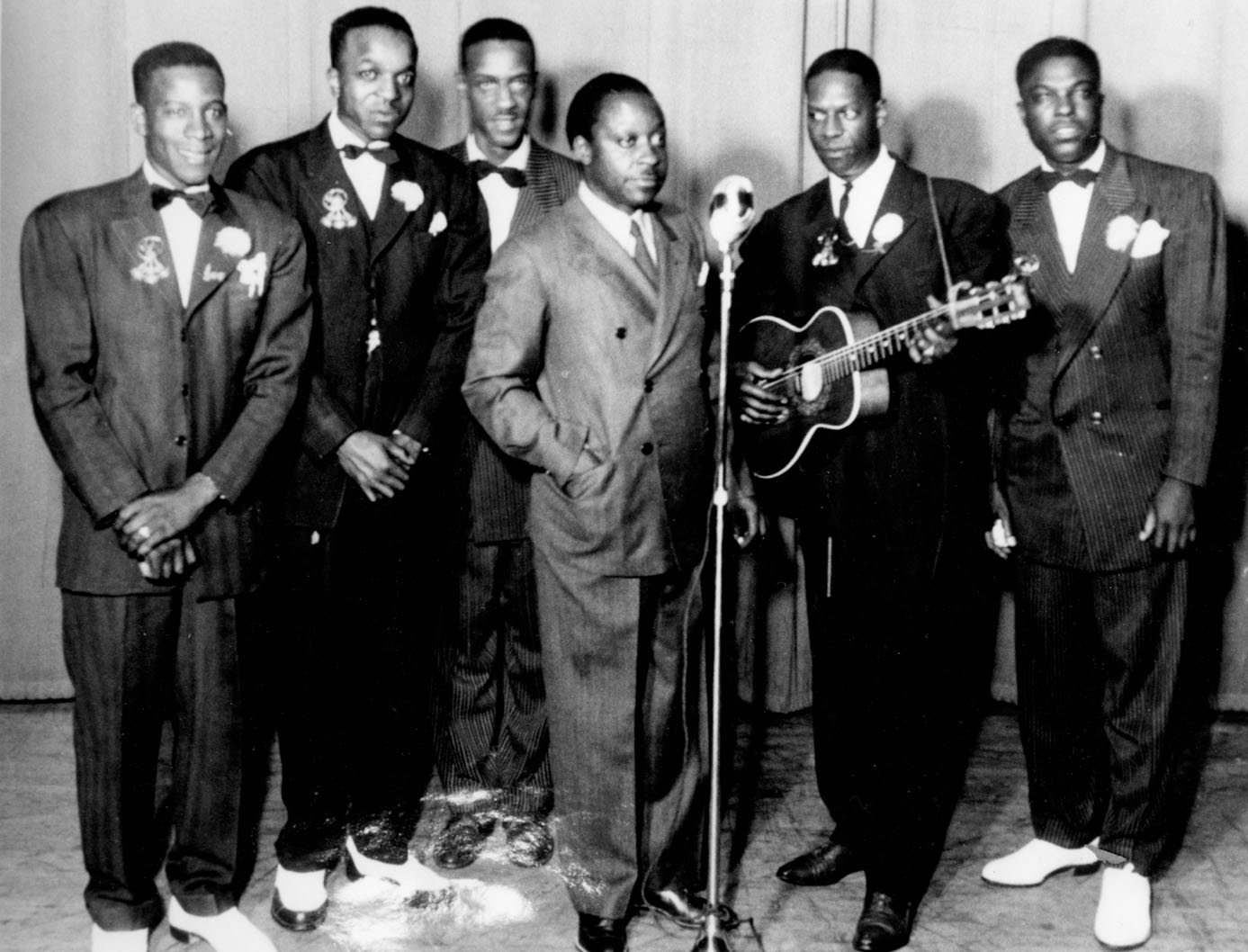 The Golden Bells Quintet, 1944. Left to right: James Maxwell, Lendy Mackie, Louis Samuel, James McLilly and Boyce Clinton. At the microphone is manager Ned Davis.