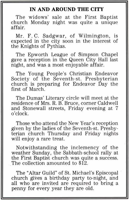 Right: A variety of social activities were regularly reported on in the In and Around the City column in the Star of Zion. These announcements are from the January 21, 1897 issue.