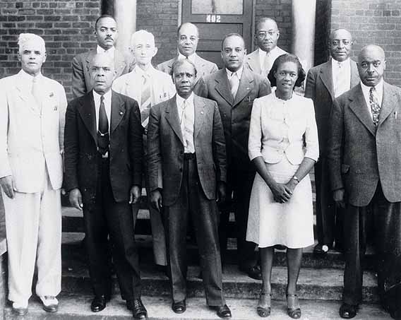 World War II Rationing Board, Colored Section.Left to right, front row: Arthur E. Grier, R. P. Wilson, Dr. Nathaniel S. Tross, Adelaide Hunt, Henry Houston.Second row: Thad L. Tate, Clarence Moreland, Jesse Bowser.Back row: Fred Alexander, Dr. Thomas Watkins, Clinton L. Blake, c. 1942.