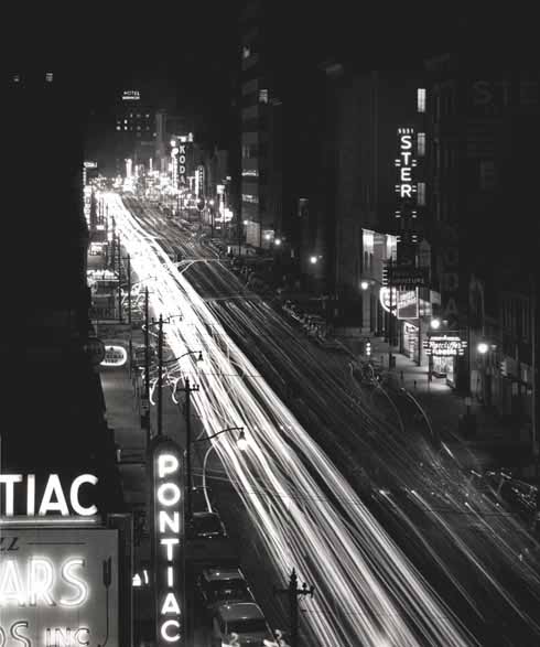 Looking north, traffic streaks down Tryon Street. Shopping options on Charlotte's main drage ranged from cars to dresses. Photo: 3/57 - Article: 3/8/57