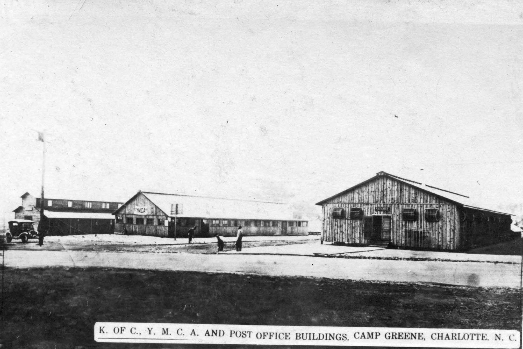 Civilian workers pause amid what the caption identifies as the "K[nights] of C[olumbus], YMCA, and the Post Office Buildings."