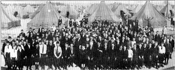 The Charlotte Schoolboy Chorus, singing "La Marseillaise," under the direction of M. Hasselmans and Robert Lee Kessler, posed for this photo. Hasselmans, who is standing left of center, was ready to return to his native France but was invited to remain in America to assist in patriotic music festival. Under the appointment of the French High Commissioner he came to Charlotte and trained the military band for six weeks prior to the Entente Allies' Patriotic Music Festival to benefit the American Red Cross on April 26-27, 1918.