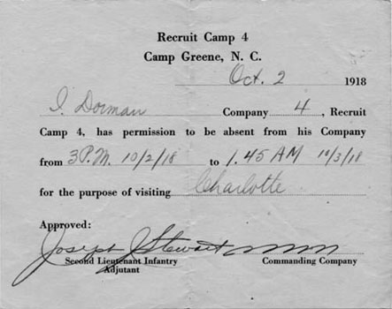Day Pass for "I. Dorman" to leave Camp Greene and visit Charlotte.