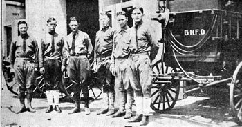 These firefighters from the Base Hospital Fire Department are standing in front of the ladder wagon on the right and the hose wagons in front of the doors. Left to right: Sgt. Wentworth Files, Arthur Overly, Lt. C. F. Harvey, Jr., head of the fire fighter organization at the base hospital, John Doyle, Corp. Herbert Freeman and John Booth