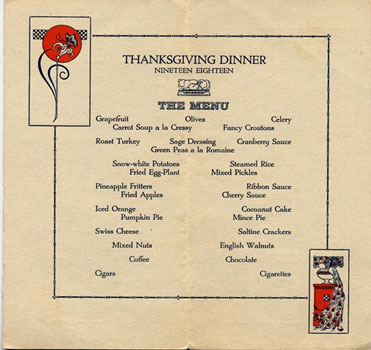 This is the menu given to patients at Camp Greene to celebrate Thanksgiving Day, 1918. The armistice had been signed just a few days earlier.