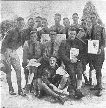 'They Have Made The Caduceus Famous.' These men helped carry the newspaper to a ninety mile radius of Charlotte. The newspaper was selling almost 10,000 copies a week by September, 1918. The points of distribution were Charlotte, Gastonia, Statesville, Salisbury, Rock Hill, Kannapolis, Concord, Monroe, Mount Holly, Belmont or Hoskins. The men are, reading the top row from left to right, Toohey, Fields, Hilsabeck, Griswold, Bissell, Townsent, Mills, Wilson and Harrington. Seated are O'Connor, Donley and Lawlor with Frank seated on the ground. 'Joe' Lawlor, the big fellow who appears to be suffering a complete relapse because of the peaceful surroundings of the evergreens and oaks and pines, is the 'Champion' salesman to date. He sold 700 copies of the Caduceus on the streets of Statesville last Saturday; and he was rained out.