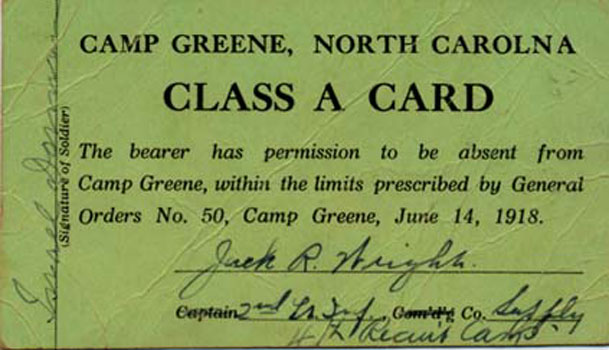 Israel Dorman's Pass to leave Camp Greene on 6/14/1918.