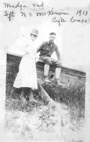 Madge Kelly Spurrier with Sgt. N.A. McKeown at the Camp Greene rifle range, West Mecklenburg County, 1918