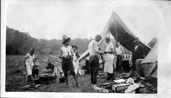 Camp Greene soldiers relax probably at the soldier's rifle range near the Catawba River. Note children in the back left of photo and the barefooted soldier in the front. Children were not allowed on the base without a pass. This fact, plus the background scenery, help identify the photo as an event that took place off the premises of Camp Greene.