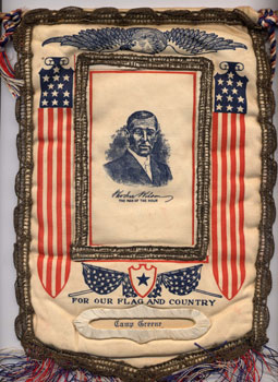 This souvenir banner shows Woodrow Wilson's image and has an interchangeable name tag so that it could be sold in various military camps. This item says "For Our Flag and Country," "Camp Greene."