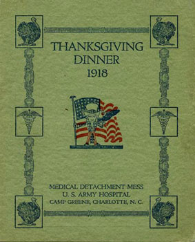 This is the printed cover of the menu was given to the Medical Detachment Mess staff at Camp Greene to celebrate Thanksgiving Day, 1918.