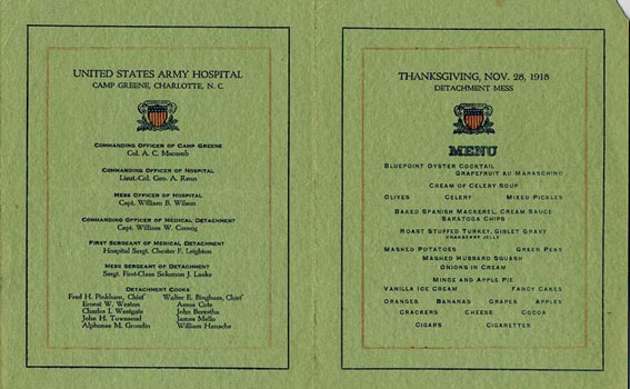 Menu for the Medical Detachment Mess at Camp Greene on Thanksgiving Day, 1918.