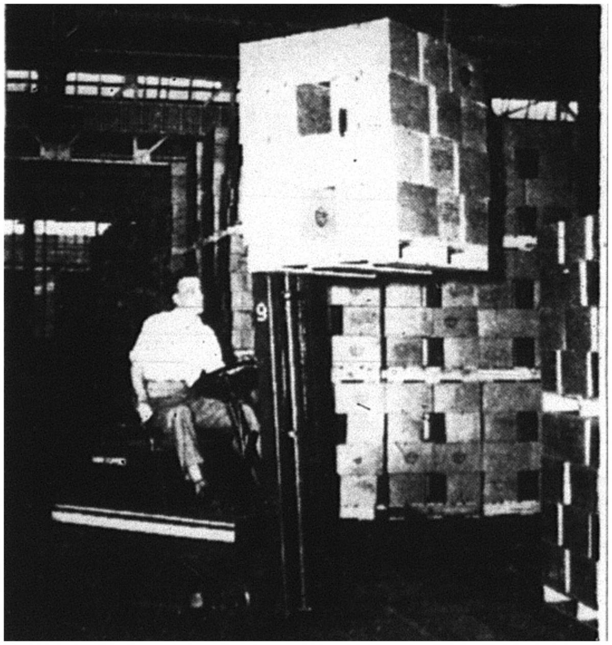 Used lumber was cut into pallets to store outside materials off the ground. Used nails, steel scrap, waste paper, cloth and tabulating cards were sorted by type. Baling machines were used to bundle the salvage into units, often weighing between 150 and 275 pounds. Other miscellaneous objects were telephone poles, a sewing machine, sewer pipes, milk cans, wheel barrows, scales and blasting machines. Much of this type of salvage was from the final clearance of CCC camps in the area.