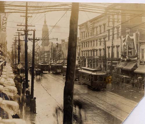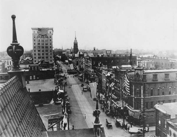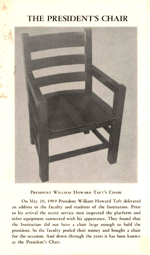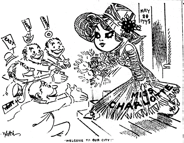 In 1909, William Howard Taft, the newly-elected president of the United States, visited Charlotte on the 20th of May. He arrived by train and was driven into town through special arches erected on Trade and Tryon Streets to welcome him. He took his place on a reviewing stand with such dignitaries as Gov. Kitchin of North Carolina and Anna Morrison Jackson, the widow of Gen. Thomas "Stonewall" Jackson. The president observed the parade from a specially made chair and made a speech congratulating Mecklenburg County on its early declaration of independence. All of this was conducted in a steady downpour of rain