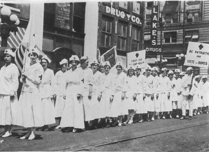 The 1919 graduating class of Red Cross Nurses march in the Mecklenburg Declaration Parade on May 20th. The photograph was taken in the first block of South Tryon Street. The Independence Building is in the background.