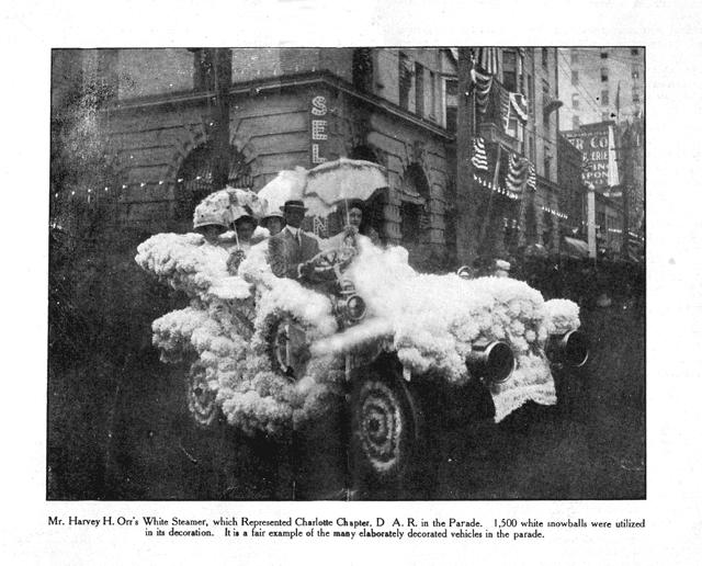 "Mr. Harvey H. Orr`s White Steamer, which Represented Charlotte Chapter, D.A.R. in the parade. 1,500 white snowballs were utilized in its decoration. It is a fair example of the many elaborately decorated items in the parade." (No date)