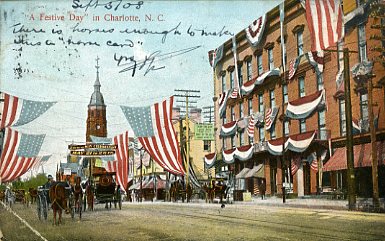 North Tryon Street was decorated with flags and banners in honor of Mecklenburg Declaration Day which was celebrated on May 20-22, 1902. This photograph was labeled as man No. 905, published by the International Post Card Company in New York. The card stock was made in Germany.