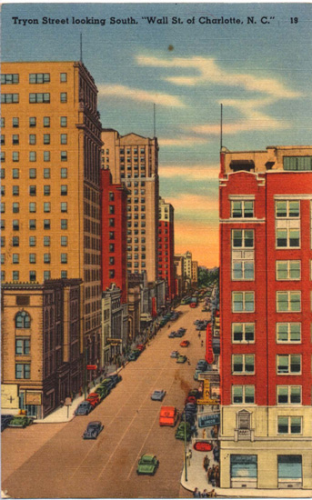 Tryon Street looking South during the 1950s. Physical Description: 3x5 Publisher: Dixie News Company