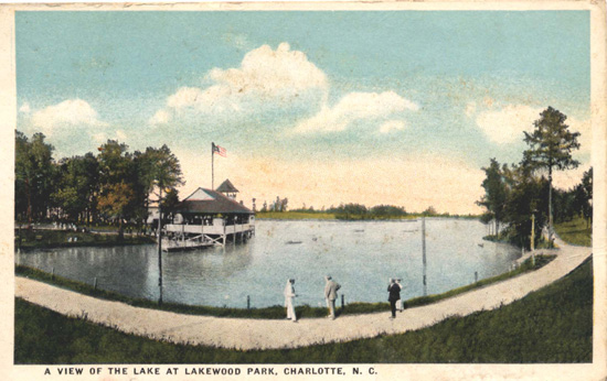 People walking along Lakewood Park. The Pavilion can be seen in the foreground. Physical Description: 3x5 Publisher: Carolina Card Company