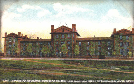 The South Graded School was one of the first public schools in Charlotte. It was formerly the Carolina Military Institute. Physical Description: 3x5 Publisher: Stone and Barringer Publishers
