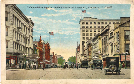 Independence Square looking south on Tryon Street. Physical Description: 3x5 Publisher: E. C. Kropp Company