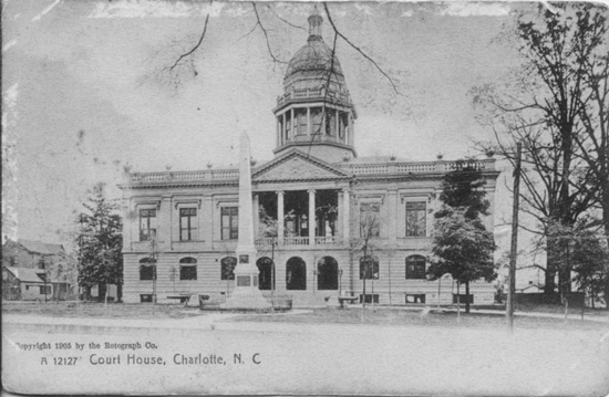 This postcard depicts the Fourth Mecklenburg County Courthouse that was built in 1897 and the Independence Monument. Physical Description: 3x5 black & white Publisher: Rotograph Company