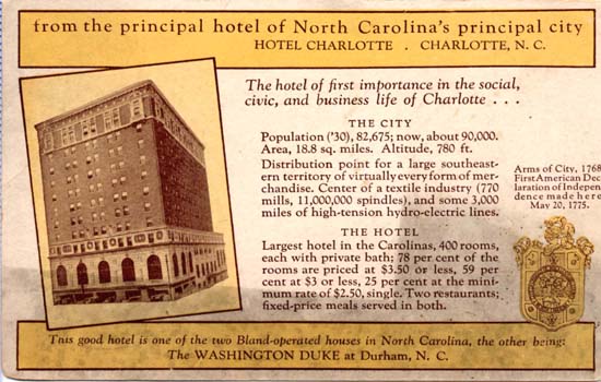 A 1930 postcard advertising the amenities of the Hotel Charlotte and the city of Charlotte. Notes about the hotel from the card reads as follows,`Largest hotel in the Carolina's, 400 rooms, each with private bath: 78 per cent of the rooms are priced at $3.50 or less, 59 per cent at $3 or less, 25 per cent at the minimum rate of $2.50, single. Two restaurants: fixed-price meals served in both.` Physical Description: 3x5 Publisher: Tavern Press