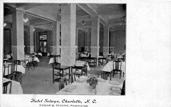 Interior shot of the Selwyn Hotel when Edgar b. Moore, was the proprietor. The Selwyn Hotel was located on West Trade Street. It opened in 1907. Physical Description: 3x5 sepia Publisher: Unknown