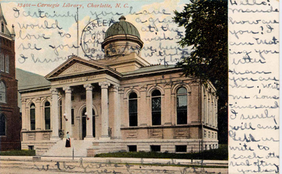The Charlotte Carnegie Library as it appeared on a postcard. This facility was demolished in the 1950s. A second and a third library have been built on this spot at 310 North Tryon Street. Physical Description: 3x5 Publisher: Souvenier Postcard Company
