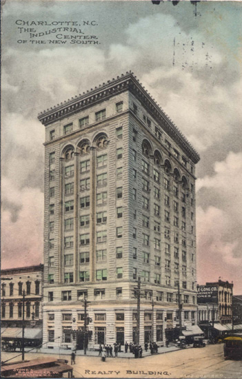 Postcard of the Realty Building with the city's motto `Charlotte, NC The Industrial Center of the New South.` Physical Description: 3x5 Publisher: Unknown