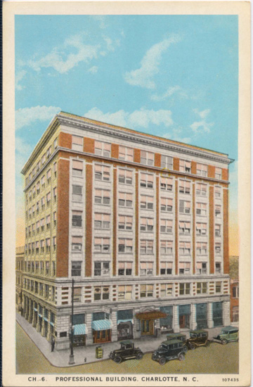 The Professional Building was designed by Louis Asbury. It was located in the 400 block of North Tryon Street. Physical Description: 3x5 Publisher: Southern Postcard Company