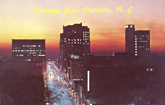View of Tryon Street at night in Charlotte, North Carolina. Physical Description: 3x5 Publisher: Dexter Press