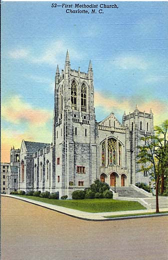 The First Methodist Church formed in 1927 with the merger of Tryon Street Methodist and Trinity Methodist. This particular building was completed in 1927 at a cost between $8000,000 and $900,000. It houses a four-manual organ, tower chimes, a 1560 seat auditorium and and a educational building. Physical Description: 3x5 Publisher: Genuine Curteich