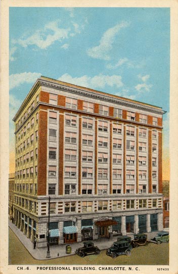 The Professional Building was located in the 500 block of North Tryon Street. Designed by Louis Asbury, the building was demolished in 1995. Physical Description: 3x5 Publisher: CT American Art