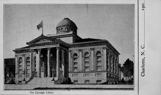 The Carnegie Library of Charlotte opened its doors in 1903 at 310 North Tryon Street. Physical Description: 3x5black and white Publisher: Unknown