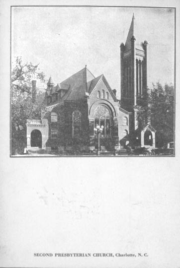 Second Presbyterian Church was located at 214 North Tryon Street. It was founded in 1873. The church merged in 1947 with Westminster Presbyterian Church to form Covenant Presbyterian Church. Physical Description: 3x5 Publisher: Unknown