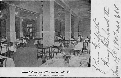 Interior shot of the Selwyn Hotel that was located on West Trade Street. Physical Description: 3x5 black and white Publisher: Unknown