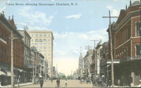 A view of Tryon Street with its new skyscraper. Physical Description: 3x5 Publisher: United States 5-1--25 Stores, Inc.