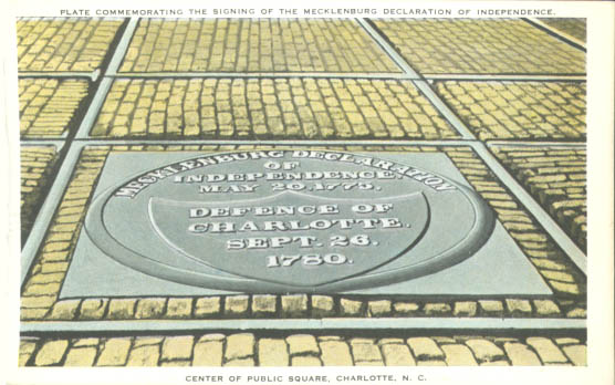This marker commemorates the signing of the Mecklenburg Declaration of Independence and the Battle of Charlotte. Made of bronze, it is imbedded in the middle of the intersection of Trade and Tryon Streets.