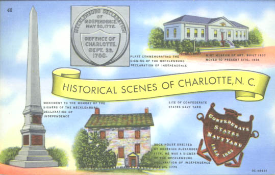 Scenes of various historical markers and buildings in Charlotte. Physical Description: 3x5 Publisher: Genuine Curteich