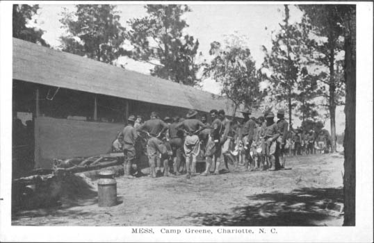 The Mess Hall at Camp Greene, the World War I military training base in Charlotte, North Carolina. Physical Description: 3x5 Publisher: A. M. Simon