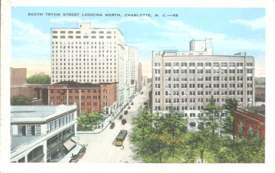 Postcard captures a view of South Tryon Street. Physical Description: 3x5 Publisher: E. C. Kropp Company