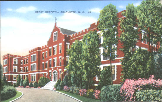 Mercy Hospital was founded by the Sisters of Mercy of Belmont, North Carolina in February 1906. Originally it was a twenty-five bed facility in a wooden building on East First Street behind St. Peter's Roman Catholic Church. The second facility, pictured here, opened in 1916 on East Fifth Street. Additions increased and by 1960, the hospital had a capacity of 300 beds. Physical Description: 3x5 Publisher: Dixie News Company