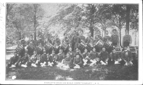 The Charlotte Drum and Bugle Corps. posed for this portrait during the Mecklenburg Declaration Celebration of May 20, 1909. Physical Description: 3x5 black and white Publisher: Unknown