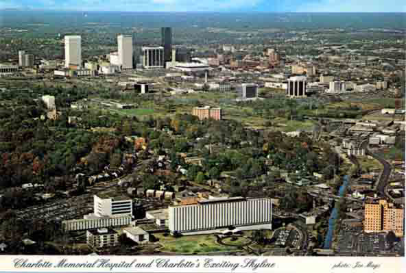 Aerial view of Charlotte includes the uptown area and the Charlotte Memorial Hospital. Physical Description: 3x5 Publisher: Aerial Photography Services, Inc.