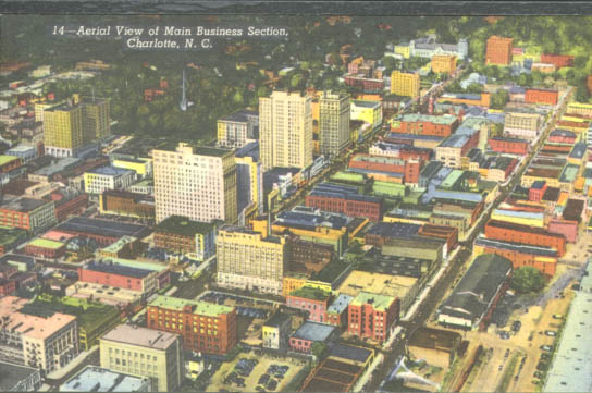 Aerial view of the Charlotte's main uptown's section. Physical Description: 3x5 Publisher: Genuine Curteich