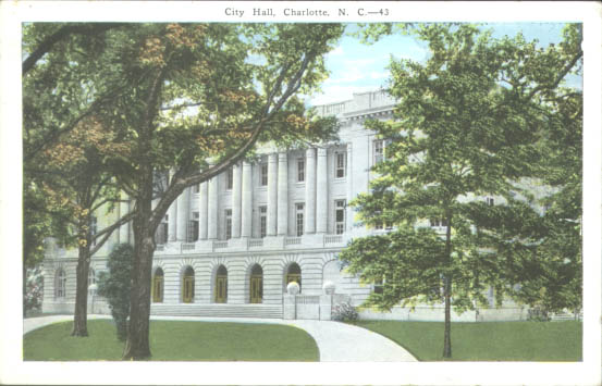 City Hall was constructed in 1920. Located on East Trade Street, it was first occupied in 1927. Physical Description: 3x5 Publisher: Genuine Curteich